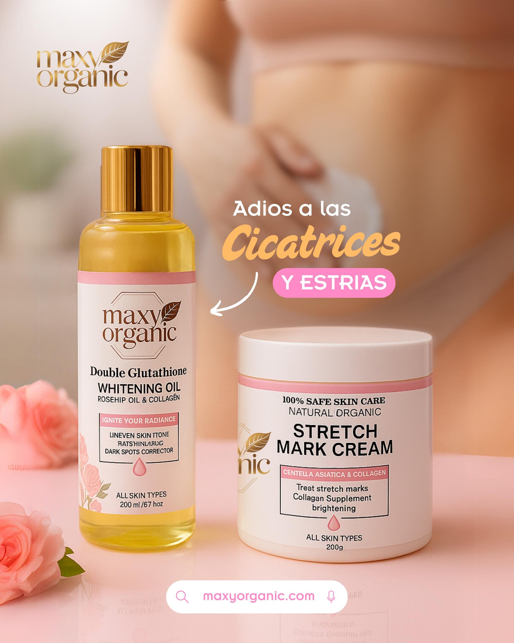 Nuestra dúo anti estrías Maxy organic es hidratante ,elimina manchas, cicatrices, reduce y previene estrias, mantiene la piel súper hidratada