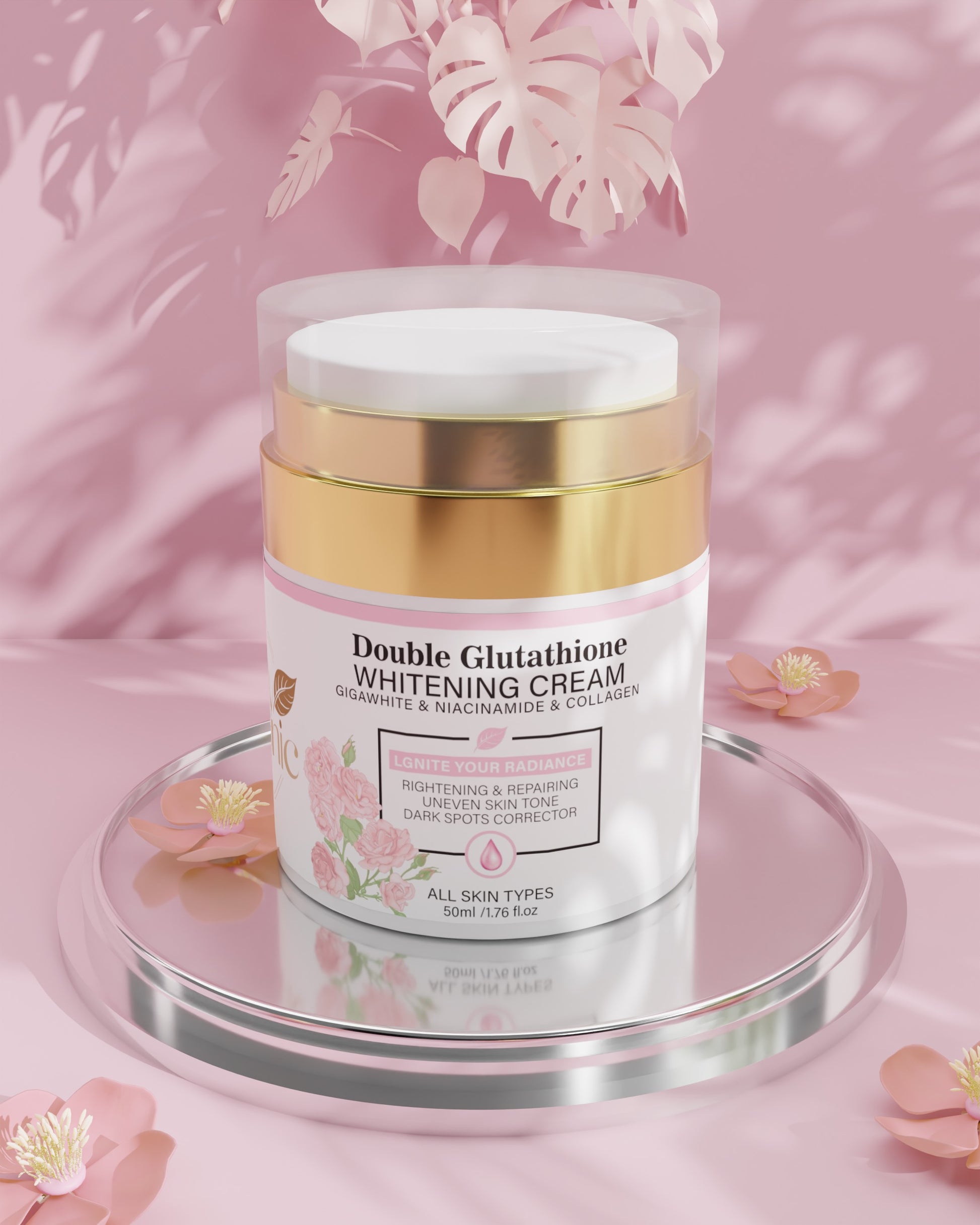 - Crema Blanqueadora con Glutatión Doble: Esta Crema Blanqueadora combate el tono desigual, proporciona hidratación intensa y ayuda a corregir manchas visibles. Enriquecida con glutatión y vitamina E, es ideal para una piel más radiante y uniforme.