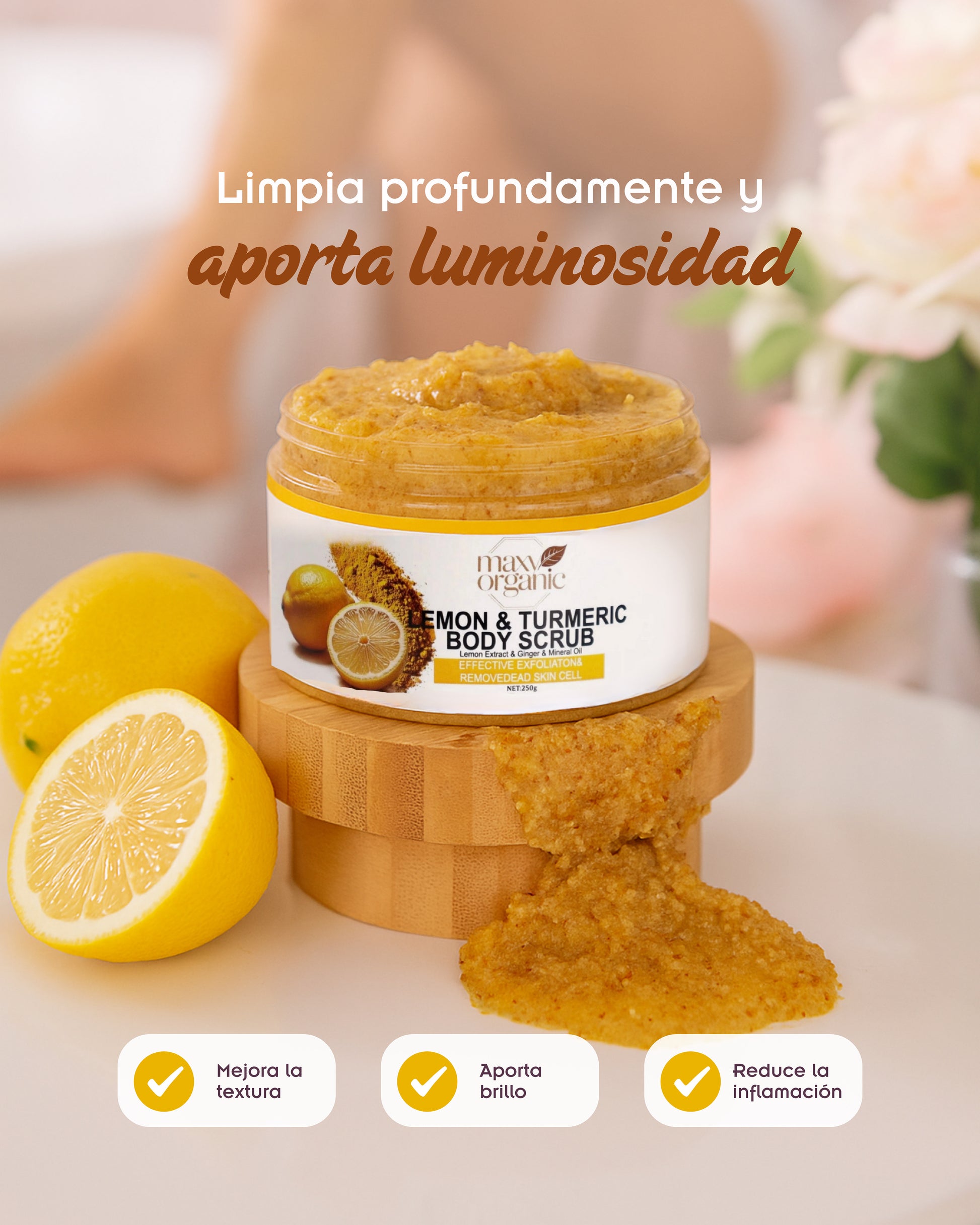 La exfoliación scrub lemon y cúrcuma sirve para limpiar profundamente la piel, eliminar células muertas, reducir manchas oscuras y darle un aspecto más luminoso y uniforme. La combinación de estos ingredientes naturales ofrece propiedades exfoliantes, aclarantes, antiinflamatorias y antioxidantes.